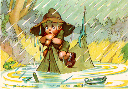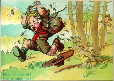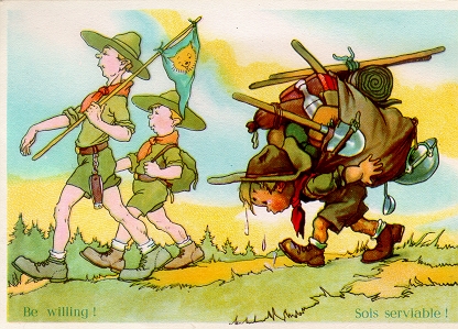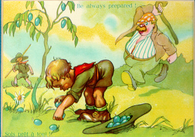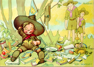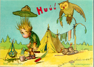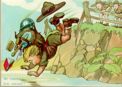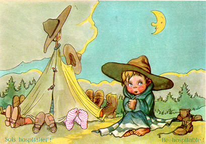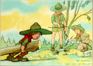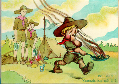 These beautiful cards were first published in Prague with Slovak titles. A second printing was published in Paris with titles in French and broken English. This printing seems to be associated with the 1947 World Jamboree that was held in France. The unknown artist is assumed to have disappeared into the Gulag shortly after. The full set probably contained ten postcards. Large size artist's sketches and watercolors of preliminary designs are known to exist.