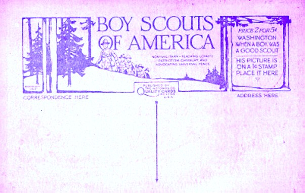 The copyright notice is on the back of the card at the base of the trees, just over the word Correspondence. The very distinctive backs show a small group of Scouts and a leader hiking over the crest of a wooded hill. Immediately above the spine, in a box clearly reserved for the purpose, is the Quality Cards trademark of the A.M. Davis Co. of Boston, Massachusetts who printed the cards.