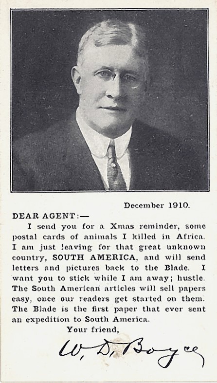 The visit to England was part of a tour that took him on a hunting expedition to Africa. A year later, Boyce sent out packets of postcards to his news agents to announce a forthcoming trip to South America and to promote sales of his publications.